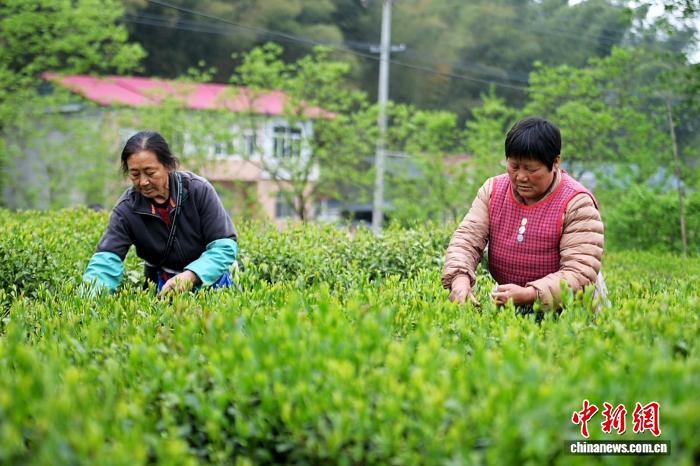 4月14日,六安市裕安区独山镇双峰村村民在采茶。 中新社记者张强摄