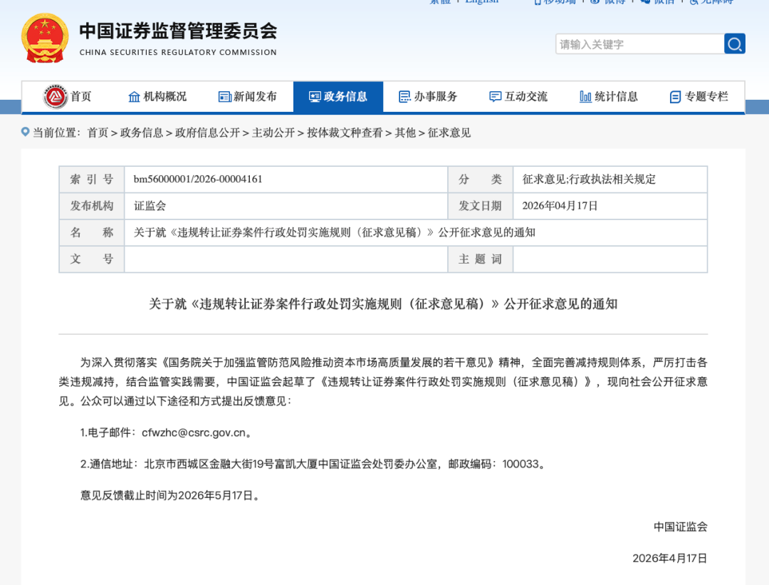 4月17日,证监会发布消息称,为深入贯彻落实《国务院关于加强监管防范风险推动资本市场高质量发展的若干意见》精神,全面完善减持规则体系,严厉打击各类违规减持,结合监管实践需要,中国证监会起草了《违规转让星空体育百科案件行政处罚实施规则(征求意见稿)》(以下简称《规则》征求意见稿),现向社会公开征求意见。意见反馈截止时间为2026年5月17日。